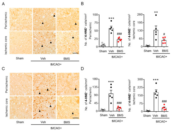 BMS administration attenuates lipid peroxidation in mice at one day and three days after tMCAO challenge. Mice were challenged with tMCAO. BMS (5 mg/kg) was administered to mice immediately after reperfusion. Effects of BMS on tMCAO-induced lipid peroxidation were assessed at one day (A,B) and three days (C,D) after tMCAO challenge. Representative images of 4-HNE-positive cells (A,C) in periischemic and ischemic core regions. Scale bars, 50 µm. Arrowheads indicate 4-HNE-positive cells. Quantification of 4-HNE-positive cells in periischemic and ischemic core regions (B,D). n = 5 mice per group. ** p < 0.01 and *** p < 0.001 versus sham. # p < 0.05 and ### p < 0.001 versus vehicle-administered tMCAO mice (Veh + tMCAO).