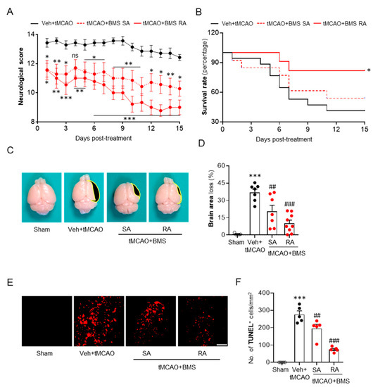 BMS administration reduces sub-acute brain injuries in mice for up to fifteen days after tMCAO challenge. Mice were challenged with tMCAO. BMS (5 mg/kg) was administered either once immediately after reperfusion (single administration of BMS, “SA”) or daily (repeated BMS administration, “RA”) for 14 days after tMCAO challenge. (A,B) Effects of BMS on neurological deficits (A) and survival (B) were determined for up to fifteen days after tMCAO challenge. n = 7 (Veh + tMCAO; black solid line), 7 (SA + tMCAO; red dotted line), and 9 (RA + tMCAO; red solid line). * p < 0.05, ** p < 0.01, and *** p < 0.001 versus vehicle-administered tMCAO mice (Veh + tMCAO). ns, not significant. (C,D) Effects of BMS on brain tissue loss were determined at day 15 after tMCAO. Representative brain images (C) and quantification (D) are shown. Black-colored areas in C indicate lost areas. n = 5 for sham, 7 for Veh + tMCAO, 7 for SA + tMCAO, and 9 for RA + tMCAO. *** p < 0.001 versus sham. ## p < 0.01 and ### p < 0.001 versus vehicle-administered tMCAO mice (Veh + tMCAO). (E,F) Effects of BMS on apoptotic cell death determined by TUNEL assay. Representative images of TUNEL-positive cells in the sub-ventricular zone (SVZ) (E) and quantification (F) are shown. Scale bar, 50 μm. n = 5 mice per group. *** p < 0.001 versus sham. ## p < 0.01 and ### p < 0.001 versus vehicle-administered tMCAO mice (Veh + tMCAO).