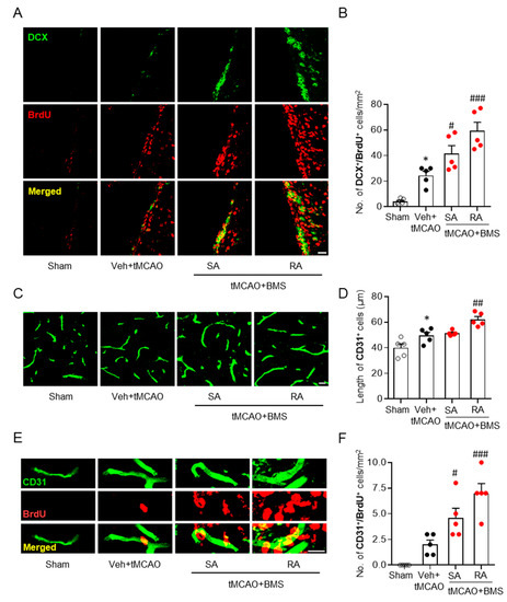 BMS administration promotes neurogenesis and angiogenesis in injured brains at fifteen days after tMCAO challenge. Mice were challenged with tMCAO. BMS (5 mg/kg) was administered either once immediately after reperfusion (single administration of BMS, “SA”) or daily (repeated BMS administration, “RA”) for 14 days after tMCAO challenge. (A,B) Effects of BMS on neurogenesis in the SVZ were determined by DCX/BrdU-double immunofluorescence staining. Representative images of DCX/BrdU-double positive cells in the SVZ (A) and quantification (B) are shown. (C–F) Effects of BMS on angiogenesis were determined by CD31/BrdU-double immunofluorescence staining. Representative images of CD31 (C) and quantification of lengths of vessels (D) are shown. Representative images of CD31/BrdU-double positive cells (E) and quantification of numbers of CD31/BrdU-double positive cells (F) are shown. Scale bars, 20 μm in A and E and 10 μm in C. n = 5 mice per group. * p < 0.05 versus sham. # p < 0.05, ## p < 0.01, and ### p < 0.001 versus vehicle-administered tMCAO mice (Veh + tMCAO).