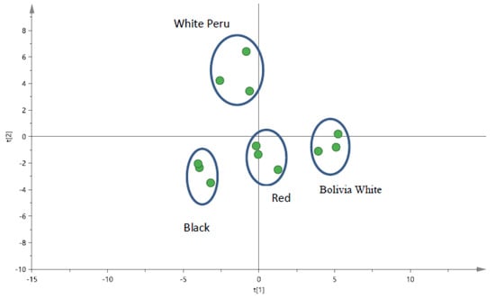 PCA score plot for quinoa seeds samples (pulverised) by pXRF for black quinoa seeds, red quinoa seeds and two different types of white quinoa seeds (Bolivia and Peru).