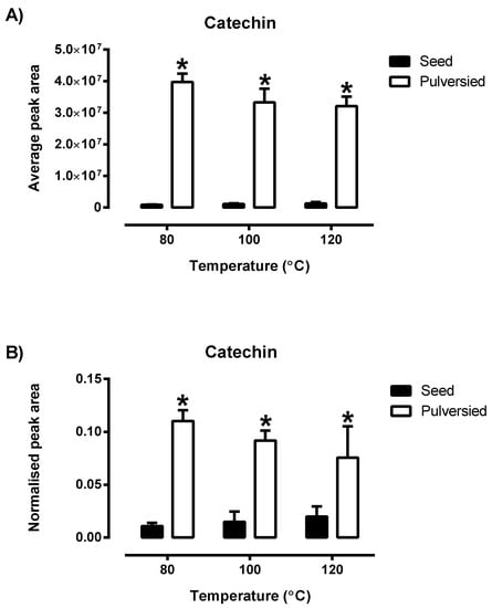 The comparison in the average peak area (A) of the phytochemical catechin with the normalised data of the peak area (B) derived from Tables S1 and S2 of the pulverised and non-pulverised Bolivian seeds (n = 3). Each value is represented by mean ± SD with significance accepted at p ≤ 0.05. * Significantly different amount of catechin was found in the pulverised as compared to non-pulverised Bolivia white quinoa (Students’ unpaired t-test).