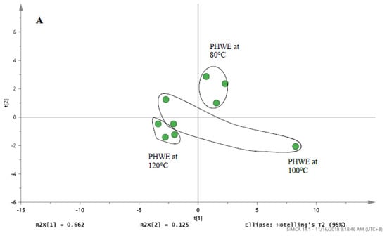 Despite their high levels of phytochemicals and promising beneficial effects as a food product, most studies on quinoa extracts have used organic solvents such as methanol and ethanol, which are commonly used to extract the constituents present in the botanicals [14,15,16]. Extraction method utilizing organic solvents would require proper waste disposal and solvent removal from the end product before they are ready for consumption. Hence, organic solvent extraction methods are not environmentally friendly and sustainable. Thus, selection of the green extraction technique is an important step that can greatly affect the end product [17,18]. Indeed, modern extraction techniques such as pressurized hot water extraction (PHWE) has become more widely accepted for the extraction of bioactive compounds from a wide variety of plant and food sources [17,18,19]. At the same time, PHWE was used for the sequential extraction of saponins, xylan and cellulose from quinoa stalks [20]. In PHWE, only water is used and temperature may be adjusted to optimise the extraction efficiency and selectivity [21]. Chemical fingerprint with HPLC, HPLC/MS and other analytical techniques with pattern recognition tools such as principal component analysis (PCA) and others are commonly used for the evaluation of botanical extract. To get to a set of components that is biased towards describing variation related to a particular feature such as class, supervised methods of analysis such as orthogonal projection to latent structure discriminant analysis (O-PLS-DA) are used [22,23,24].