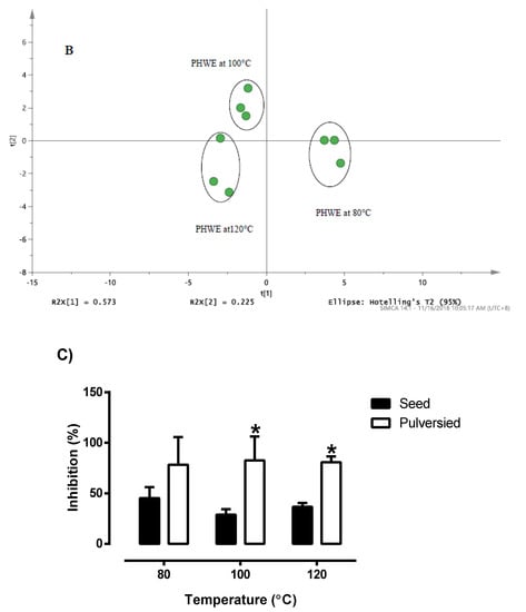 The PCA score plot of (A) LC/MS profile for white Bolivia seed derived from Table 1. (B) LC/UV profile for white Bolivian quinoa seed detected at 280 nm. (C) Radical scavenging activity of pulverised and non-pulverised white Bolivian quinoa seeds extracted at 80, 100 and 120 °C. * Significant difference between the whole seeds and pulverized seed at a given temperature (Students’ unpaired t-test). Results are mean ± SD (n = 3) with the significance accepted at p ≤ 0.05.