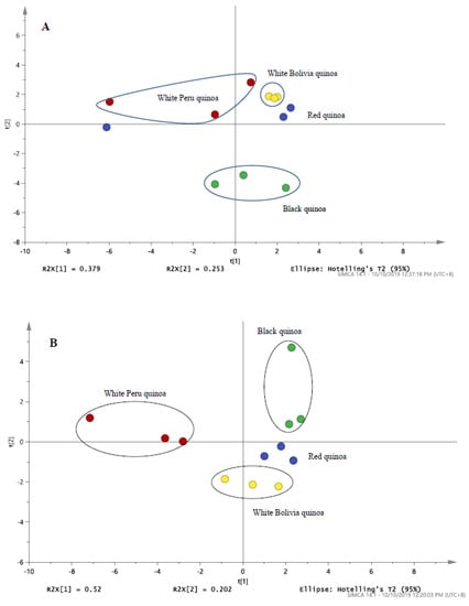 The PCA score plot of (A) LC/MS profile for black, red and white (Peru and Bolivia) quinoa derived from Table 1 (B) LC/UV profile for black, red and white quinoa detected at 280 nm.