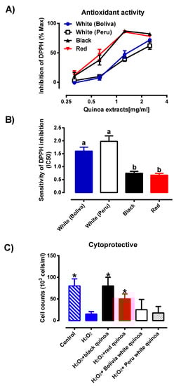 (A) Percentage of inhibition of pulverised quinoa seeds from the black, red and white pulverised seed extracts (Bolivia and Peru) were investigated (n = 6), where each result is represented by mean ± SD with the significance of p ≤ 0.05. (B) Sensitivity of DPPH assay of pulverised quinoa seeds from the black, red and white pulverised seed extracts (Bolivia and Peru) were investigated (n = 6), where each result is expressed as mean ± SD. Different letters (a, b) represents significantly different (p ≤ 0.05) from one another (C) Protective effects of extracts from quinoas on H2O2-induced cytotoxicity on the HMEC-1 cell line. HMEC-1 cells were administered with treatment medium over a period of 48 h. Cell viability was determined by cell counting (n = 4) before expressing as a cell concentration (cells/mL). Each value represents mean ± SD with the significance accepted at p ≤ 0.05. * Significantly different between cells treated with H2O2 alone (one-way ANOVA, Tukey’s test).