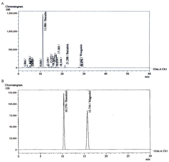 To optimize the extraction of phenolic compounds from SBR and MOB, various ethanol concentrations and extraction times (see Tables S1 and S2), and treatments with different solvents (butanol, chloroform, acetone, and hexane) for different time periods were tested. The total baicalin content (64.2%) in SBR extract was maximized via extraction with 0% ethanol for 2 h followed by treatment with 1.5% phosphoric acid for 0.5 h. Extraction with 50% ethanol for 2 h followed by hexane treatment for 0.5 h resulted in the MOB extract with the highest total magnolol and honokiol contents (51.2%). Each polyphenol in the extracts of GenoTX-407 (Figure 1), SBR, and MOB (Figure S1) was identified by HPLC.