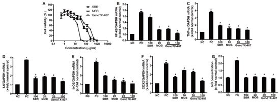 Anti-inflammatory activities of SBR, MOB, and GenoTX-407. (A) Cell viability in response to SBR, MOB, and GenoTX407 in the MTT assay. (B–F) Real-time PCR for checking the mRNA expression of NF-κB (B), TNF-α (C), IL-6 (D), iNOS (E), and COX2 (F), normalized to GAPDH. (G) Inhibitory effect on LPS-induced NO generation. *Significantly different from normal controls (p < 0.05). # Significantly different from positive controls (p < 0.05). SBR, Scutellaria baicalensis root; MOB, Magnolia officinalis barks; GenoTX-407, combination of SBR and MOB; LPS, lipopolysaccharide.