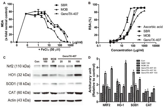 Antioxidant activities of SBR, MOB, and GenoTX-407. (A) Inhibitory effect on FeCl3-induced lipid peroxidation (TBARS production) (B) 1,1-diphenyl-2-picrylhydrazyl (DPPH) radical-scavenging activity in 30 min. (C,D) Western blotting to check the expression of Nrf2, HO-1, SOD1, and CAT in response to individual treatments (C). Band densities normalized to GAPDH (D). * Significantly different from vehicle controls (p < 0.05). SBR, Scutellaria baicalensis root; MOB, Magnolia officinalis barks; GenoTX-407, combination of SBR and MOB.