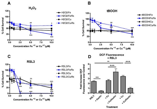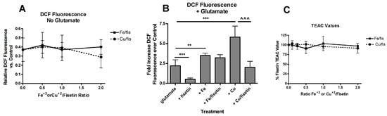 3.1. Addition of Fisetin Shifts the Dose Response Curve for Iron and Copper Potentiation to Higher Concentrations