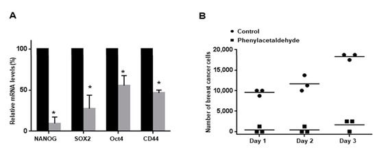 Phenylacetaldehyde (PAA), a flower flavor, inhibits formation on BCSCs. PAA reduced cell proliferation and increased apoptosis of breast cancer. PAA also inhibited tumor growth in the in vivo mouse. PAA decreased the CD44+/CD24− and ALDH1-expressing cell, mammosphere formation, and CSC marker genes. PAA preferentially induced reactive oxygen species (ROS) production and induced the decrease of Stat3 phosphorylation. Combined treatment with PAA and N-acetyl cysteine (NAC) reduced Stat3 phosphorylation. Therefore, PAA inhibits CSCs formation through the ROS-dependent Stat3/IL-6 signal. PAA inhibited Stat3 signaling through dephosphorylation of Stat3 and reduced secretory IL-6. Our data suggest that PAA is useful for breast cancer treatment and the Stat3/IL-6 signal as a marker for CSCs targeting.