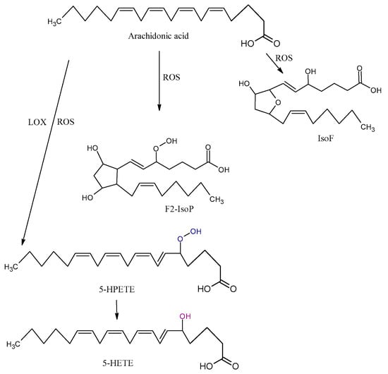 Arachidonic acid is vulnerable to free-radical-mediated oxidation. As consequences of this process, six hydroperoxyeicosatetraenoic acid products (5-, 8-, 9-, 11-, 12-, and 15-hydroperoxyeicosatetraenoic acid (HPETE)) are formed (Figure 3). Some of them may be generated by LOX enzymes [45]. All the HPETE molecules may be further reduced, generating hydroxyeicosatetraenoic acid (HETE). Literature data indicate that 15-HETE incorporates into phospholipids, especially phosphatidylinositol, and thus changes its structure and function and indirectly influences signal transduction in the cells [46]. 20-HETE is another product of AA oxidation that is formed by mediation cytochrome P450 oxidoreductase.