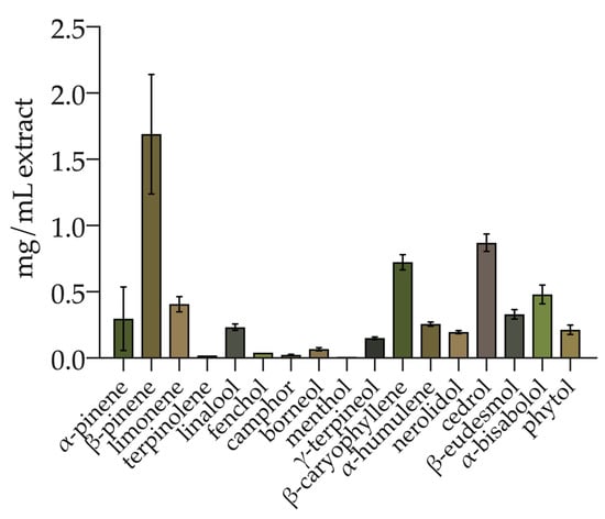 The total phenolic compounds were determined spectrophotometrically. The hemp ethanolic extract displayed a TPC of 1.80 ± 0.25 mg GAE/mL (equal to 19.73 ± 3.04 mg GAE/g inflorescence). In addition, the terpenes and CBD were simultaneously determined. Seventeen terpenes were identified and quantified (Figure 1) with a total amount of 6.00 ± 0.73 mg/mL of extract. The monoterpenes were 48.76% of total terpenes, while sesquiterpenes and diterpenes represented 47.65% and 3.59%, respectively. Among the monoterpenes, β-pinene, limonene, α-pinene, linalool, γ-terpineol, borneol, fenchol, camphor, terpinolene, and menthol were identified. Sesquiterpenes included cedrol, β-caryophyllene, α-bisabolol, eudesmol, α-humulene, and cis-nerolidol. Phytol was the only diterpene identified. The most abundant compound was β-pinene (1.69 ± 0.45 mg/mL; 28.17% of the total), followed by cedrol (0.87 ± 0.07 mg/mL; 14.5% of the total) and β-caryophyllene (0.72 ± 0.06 mg/mL; 12% of the total). The terpene profile is detailed in Table S1 (Supplementary Materials).