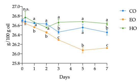 On the basis of results, no significant changes in SFAs, MUFAs, and PUFAs were observed in HO (p > 0.05), while significant differences were observed for CO and EO. After three days, CO displayed a significant decrease in the PUFA content equal to 0.40%, while, in EO, the decrease was even more intense, with a significant reduction in PUFAs by 0.84% after 2 days. At the end of the experiment, the content of both saturated and unsaturated fatty acids was not different between CO and HO; however, there was a mild tendency of CO toward oxidation, displaying intermediate values between HO and EO, except for MUFAs.