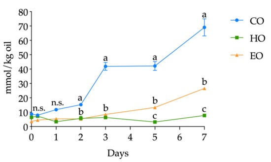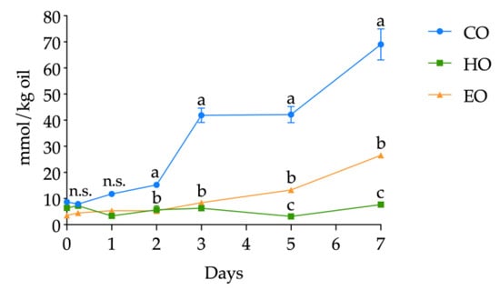 Kinetics of hexanal content (mmol/kg oil) in stripped linseed oil without antioxidants (CO), with hemp extract (HO), and with α-tocopherol (EO) and results of ANOVA with Duncan’s test. Each point represents the mean ± standard deviation of three independent replicates (n = 3). Different letters a–c within the same day are significantly different at p < 0.05. n.s. = not significant.