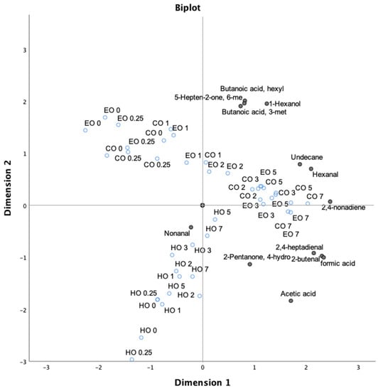 Bi-plot of volatile compounds (black circles), excluding the terpenoid compounds, and treatment time (empty blue circles) in thermo-oxidized bulk oils (stripped linseed oil without antioxidants (CO), with hemp extract (HO), and with α-tocopherol (EO)).