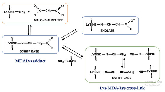 MDA can generate a diversity of adducts and intra- and inter-molecular cross-links resulting of the chemical and non-enzymatic modification of nucleophilic groups in macromolecules like proteins, but also nucleic acids and aminophospholipids (phosphatidylethanolamine (PE) and phosphatidylserine (PS)). Therefore, MDA can also react with the exocyclic amino groups of nucleosides to form alkylated products. Among DNA bases, the high nucleophilicity of guanine results in a higher vulnerability to generate adducts, MDA-deoxyguanosine (M1dG) being the most common [27,28,29]. Finally, MDA can also react with amino groups of aminophospholipids to generate adducts as MDA-PE [30]. Figure 2 shows a scheme for the formation of the MDALys adduct and the lys-MDA-lys cross-link by the reaction of malondialdehyde with lysine residues in proteins.