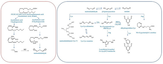 The reaction of malondialdehyde (MDA) with the amino group of the side chain of lysine (Lys) residues in proteins via a Schiff base reaction (reversible covalent adduct) leads to the formation of the malondialdehyde-lysine (MDALys) adduct and the lys-MDA-lys cross-link [8,9,10,11,12,13,14,15]. MDA can also generate a Lys fluorescent adduct and Arg–Lys cross-link adduct [10,13,16,17,18]. This non-enzymatic reaction is called protein lipoxidation [5] and the generated products are called Advanced Lipoxidation End-products (ALEs) [5,19]. Figure 1 shows the formation of the MDALys adduct and the lys-MDA-lys cross-link by the reaction of malondialdehyde with lysine residues in proteins.