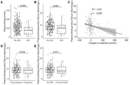 To assess whether plasma-free thiol levels could predict the course of AKI, we correlated plasma-free thiol levels measured upon admission with the serum creatinine levels that were measured daily during admission. The median serum creatinine levels upon admission were higher in patients with AKI progression (91 (72–131) µmol/L) as compared to patients without AKI progression (72 (59–88) µmol/L; p < 0.05; Appendix B Table A2). In both AKI progression and new-onset AKI, no significant differences were found in albumin-adjusted plasma-free thiol levels (p > 0.05; Figure 1D,E).