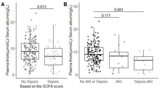 Albumin-adjusted plasma-free thiol levels were significantly reduced in patients with sepsis (6.95 (3.72–8.92) µmol/g) compared to patients without sepsis (8.30 (5.52–10.64) µmol/g; p < 0.05; Figure 2A). When separating AKI patients into groups with and without sepsis, we observed that patients with sepsis-associated AKI had lower levels of albumin-adjusted free thiol levels (6.8 (2.0, 7.9) µmol/g) compared to patients without both sepsis and AKI (8.4 (5.8, 10.8) µmol/g; p < 0.05). However, we found no difference in plasma albumin-adjusted free thiol levels between patients with AKI with sepsis compared to patients with AKI without sepsis (7.0 (3.5, 9.5) µmol/g) compared to patients without AKI and/or sepsis (p > 0.05; Figure 2B). Together, these data suggest that free thiol levels are mainly reduced in sepsis-associated AKI.