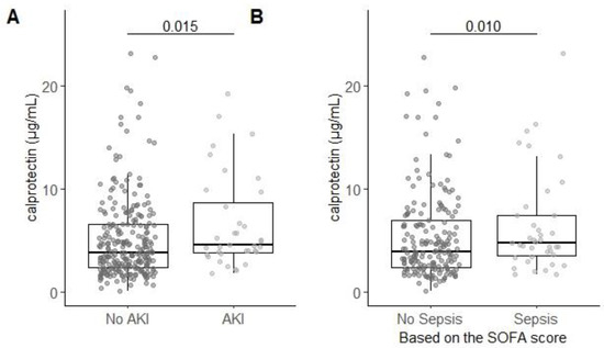 Figure 3. Serum calprotectin levels are correlated with AKI and sepsis. (A) Serum calprotectin levels were higher in patients with AKI as compared to patient without AKI. (B) Serum calprotectin levels were higher in patients with sepsis as compared to patient without sepsis. Group differences are calculated using a two-tailed Mann-Whitney U test.