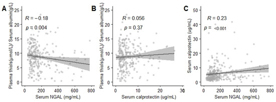 Higher age (B = −0.72, p < 0.001), higher levels of neutrophil gelatinase-associated lipocalin (NGAL) (B = −0.002, p < 0.05), higher creatinine, higher CRP (B = −0.01 and B = −0.01, p < 0.05), and lower serum albumin (B = 0.47, p < 0.001; Table 3) were associated with lower plasma-free thiol levels. In contrast, plasma levels of calprotectin did not associate with plasma-free thiol levels (p > 0.05; Figure 4B). Of note, calprotectin and NGAL were positively correlated with each other (R = 0.23, p < 0.05; Figure 4C).