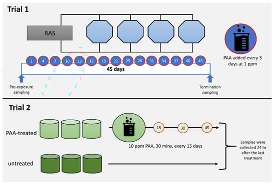 Diagrammatic summary of the in vivo trials. Trial 1 aimed to profile the impacts of periodic and low dose peracetic acid (PAA) application (1 ppm, every 3 days over 45 days), while Trial 2 was designed to investigate the nasal responses following less frequent and high dose PAA treatment (10 ppm for 30 min, every 15 days, 3 times). Details of each trial are described in Section 2.1.