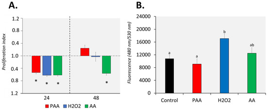 The proliferation of nasal leukocytes 24 h after the challenge was significantly affected by PAA, as well as by its two main components, H2O2 and AA (Figure 2A). Cellular proliferation reduced by at least 0.5-fold in all treatment groups and no inter-treatment differences were observed. After 48 h, nasal leukocytes exposed to PAA and H2O2 slightly recovered, and the proliferation rate did not significantly differ from that of the control group. However, the effect of AA on proliferation was still persistent after 48 h, when the proliferation index in the group was 0.6-fold lower compared to control. Moreover, a significant difference was observed between the AA-exposed and two other treatment groups.