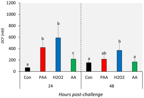 Levels of intracellular reactive oxygen species in nasal olfactory leukocytes exposed to different oxidative chemical stressors. The level was measured at 24 and 48 h after exposure to 100 µM of PAA (peracetic acid), H2O2, and AA (acetic acid) for 30 min. The control group was handled similarly, but without any chemical stimulation. Two-way ANOVA followed by the Holm–Sidak test identified statistical difference amongst the treatment groups over time. Different letters a,b indicate a significant difference at p < 0.05 between groups within a time-point. There was no time-related difference within a treatment group. Results are presented as mean ± SD of 5 wells, with cells from 12 fish.