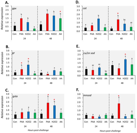 Changes in the expression of antioxidant defence genes following exposure to oxidative chemical stressors (A–F). The transcript level of six selected genes (i.e., gpx, gr, gsta, cat, cu/zn sod, mnsod) was quantified by RT-qPCR at 24 and 48 h after exposure to 100 µM of PAA, H2O2, and AA for 30 min. The control group was handled similarly, but without any chemical stimulation. Two-way ANOVA followed by the Holm–Sidak test identified statistical difference amongst treatment groups over time. Different letters indicate a significant difference at p < 0.05 amongst the treatment groups within a time-point. Asterisk (*) denotes that the level in a treatment group differs between the two time-points. Results are presented as mean ± SD of four wells, with ca. 105 cells from 15 fish.