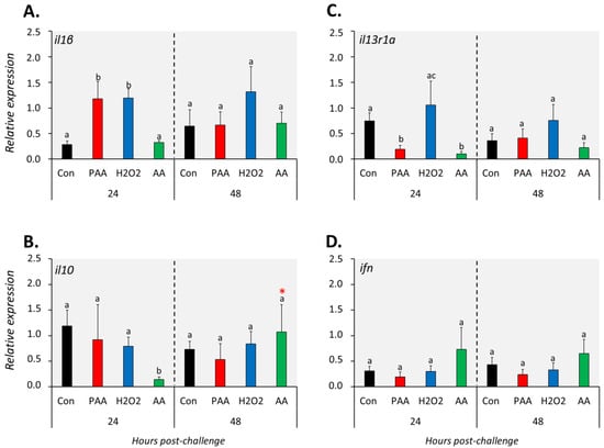Changes in the expression of cytokine genes following exposure to oxidative chemical stressors (A–D). The transcript level of 4 selected genes (i.e., il1β, il10, il13r1a, ifn) was quantified by RT-qPCR at 24 and 48 h after exposure to 100 µM of PAA, H2O2, and AA for 30 min. The control group was handled similarly, but without any chemical stimulation. For the explanation on statistics and notations, please refer to Figure 4.