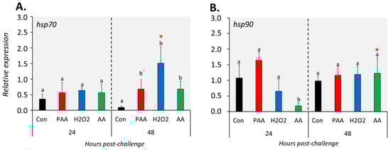 Changes in the expression of gene coding for heat shock proteins following oxidative chemical challenge (A,B). The transcript level of two selected genes (i.e., hsp70, hsp90) was quantified by RT-qPCR at 24 and 48 h after exposure to 100 µM of PAA, H2O2, and AA for 30 min. The control group was handled similarly, but without any chemical stimulation. For the explanation on statistics and notations, please refer to Figure 4.