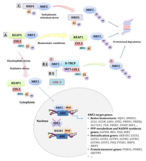 Regulation of the NRF2 pathway. NRF2 is regulated by three E3 ubiquitin ligases. The main regulation is by the complex KEAP1-CUL3-RBX1 (A). Additionally, NRF2 can be regulated by the β-TRCP-SKP1-CUL1-RBX1 complex in a GSK-3-dependant (B1) or -independent (B2) manner. Upon endoplasmic reticulum stress, NRF2 can also be regulated by HRD1 (C). The main regulation (A) involves the repression of NRF2 by KEAP1 and its proteasomal degradation in basal conditions, while, under oxidative stress conditions, the NRF2-KEAP1 binding is disrupted, leading to NRF2 nuclear translocation and the activation of its target genes. Other mechanisms of NRF2 repression involve the β-TRCP-SKP1-CUL1-RBX1 complex (B 1/2) that, through binding with the Neh6 domain of NRF2, particularly enhanced by the GSK-3 phosphorylation of NRF2, or, by the binding of endoplasmic reticulum stress-induced HRD1 (C) with the Neh4-5 domains of NRF2, mediate its degradation. In addition, other proteins, such as BACH1, can negatively regulate the transcriptional activation of the NRF2-target genes by competing with NRF2. Abbreviations: AKR1B3—aldo-keto reductase family 1 member B; ARE—antioxidant response element; BACH1—BTB and CNC homolog 1; β-TRCP—β-transducin repeat-containing protein; CUL1—cullin 1; CUL3—cullin 3; E2—ubiquitin-conjugating enzyme 2; G6PDH—glucose-6-phosphate dehydrogenase; GCLC—glutamate-cysteine ligase, catalytic subunit; GCLM—glutamate-cysteine ligase, modifier subunit; GPX2—glutathione peroxidase 2; GSR1—glutathione reductase 1; GSTA—glutathione S-transferase alpha; GSTM—glutathione S-transferase mu; GSTP—glutathione S-transferase pi; HMOX-1—heme oxygenase 1; HRD1—E3 ubiquitin-protein ligase synoviolin, SYVN1; IDH1—isocitrate dehydrogenase 1; KEAP1—Kelch-like ECH-associated protein 1; MAF—musculoaponeurotic fibrosarcoma; ME1—malic enzyme 1; MRP—multidrug resistance-associated proteins; NQO1—NAD(P)H quinone dehydrogenase 1; NRF2—nuclear factor, erythroid 2 like 2; PGD—phosphogluconate dehydrogenase; PRDX—peroxiredoxin; PSMA1—proteasome 20S subunit alpha 1; PSMB5—proteasome 20S subunit beta 5; PTGR1—prostaglandin reductase 1; RBX1—ring-box 1; SKP1—S-phase kinase-associated protein 1; SLC7A11—solute carrier family 7 member 11; SQSTM1—sequestosome 1.; SRX1—sulfiredoxin 1; TRXR1—thioredoxin reductase 1; TXN—thioredoxin; TXNIP—thioredoxin interacting protein; ub—ubiquitin.