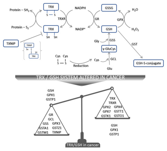 Schematic presentation of TRX and GSH antioxidant defense mechanisms. Oxidized TRX is reduced to the active reduced form of TRX by TRXR that uses NADPH as the main electron source. Reduced TRX reduces oxidized substrates. However, this can be inhibited by TXNIP, resulting in TXNIP-TRX complex formation. Moreover, extracellular cystine once imported in the cell can be reduced by the TRX system and used for GSH synthesis. GCL catalyzes the formation of γ-GluCys from Cys and Glu. Further addition of Gly by GSS produces GSH. During the detoxification of ROS, GSH is converted to GSSG and its recycling depends on GR and NADPH. In addition, during the detoxification of other molecules—e.g., 4-HNE—GSH conjugation by GST is the main step. In cancer, TRX and/or GSH systems are altered and their expression in cancer is schematically presented. Abbreviations: Cys—cysteine, γ-GluCys—gamma glutamylcysteine, GCL—glutamate cysteine ligase, Glu—glutamine, Gly—glycine, GSH—glutathione, GSS—glutathione synthetase, GPX—glutathione peroxidase, GR—glutathione reductase, GSH—reduced glutathione, GSSG—oxidized glutathione, GST—glutathione S-transferase, NADP+—oxidized NADPH, NADPH—nicotinamide adenine dinucleotide phosphate, TXNIP—thioredoxin interacting protein, TRX—thioredoxin, TRXR—thioredoxin reductase.