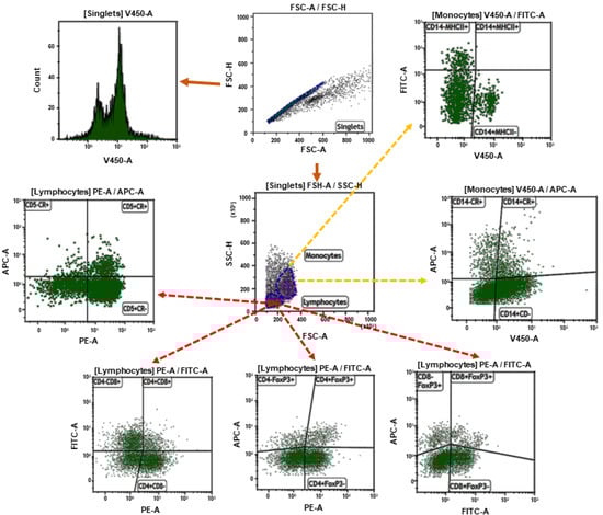 The flow cytometric analysis was performed using a FACSCanto II flow cytometer and Kaluza 1.5. software (Beckman Coulter, Brea, CA, USA); 10,000 cells of each sample were acquired. Prior to multicolor staining, the compensation was set using single-positive cells for each color. The gating strategy has been shown in Figure 1.