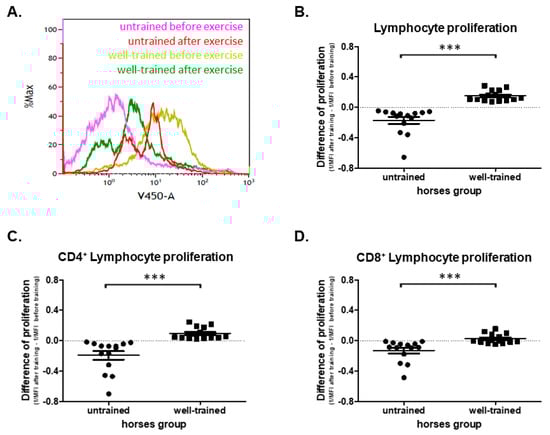 (A) Representative histogram showing T lymphocyte proliferation obtained before and after exercise from untrained and well-trained horses. The graph shows total (B), CD4+ (C), and CD8+ (D) lymphocyte proliferation. The results are presented as the mean ± SEM. Significance levels are: *** p < 0.001.