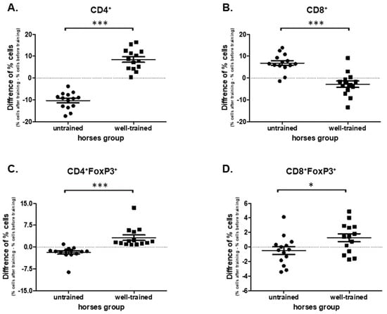 The statistically significant impact of the exercise (before vs. after) on the percentages of CD4+FoxP3 and CD8+FoxP3 regulatory cells was observed in both groups. In UT horses there was a decrease (p = 0.0006; 5.39 ± 0.527 vs. 3.55 ± 0.324), whereas in WT horses an increase (p < 0.0001; 4.68 ± 0.299 vs. 7.90 ± 0.860) in the percentages of CD4+FoxP3 cells (Supplementary Figure S2C,D). No effect of exercise was observed in the percentages of CD8+FoxP3 cells in the UT group (p = 0.3258; 3.85 ± 1.43 vs. 3.36 ± 1.84). However, an increase in CD8+FoxP3 cells in WT horses was noted (p = 0.0494; 3.85 ± 0.832 vs. 5.13 ± 2.230) (Supplementary Figure S2C,D). The analysis of the exercise impact on the T regulatory cells subpopulations showed differences between UT and WT horses in CD4+FoxP3 (p < 0.0001; −1.84 ± 0.582 vs. 3.22 ± 0.930), and CD8+FoxP3 (p = 0.0296; −0.486 ± 0.531 vs. 1.28 ± 0.552) cell subpopulations (Figure 3C,D).