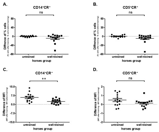 A reduced influence of exercise (before vs. after) on the CD5+CR+ cells’ percentages in WT (p = 0.0494; 10.9 ± 3.560 vs. 4.14 ± 0.586) and UT (p = 0.9032; 6.71 ± 0.875 vs. 6.98 ± 1.100) horses was noted (Supplementary Figure S4B). No statistically significant change was found (p = 0.0863) in CD5+CR+ cells between UT (0.0269 ± 0,995) and WT (−6.79 ± 3.83) horses (Figure 5B). The intensity of ROS production by CD5+ cells was increased after exercise in UT (p = 0.0353; 2.67 ± 0.194 vs. 3.16 ± 0.224), but not in WT (p = 0.2718; 3.39 ± 0.263 vs. 3.53 ± 0.298) horses (Supplementary Figure S5D). Nevertheless, no differences (p = 0.1197) in this examined parameter were observed between UT (0.489 ± 0.182) and WT (0.140 ± 0.118) horses (Figure 5D).
