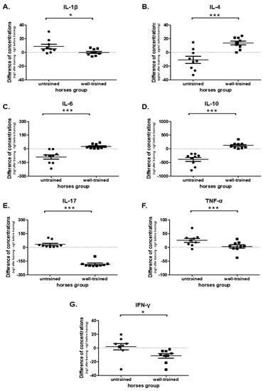 Graphic representation showing the cytokine concentrations: IL-1β (A), IL-4 (B), IL-6 (C), IL-10 (D), IL-17 (E), TNF-α (F), and IFN-γ (G) presented in culture medium of PBMCs obtained from untrained and well-trained horses. The results are presented as the mean ± SEM. Significance levels are: * p < 0.05; *** p < 0.001.