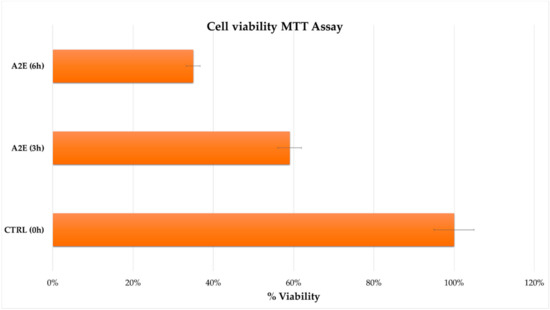 The MTT assay highlighted a significant impact of A2E treatment on RPE cells viability in a time-dependent manner. In contrast to the control group, the viability of treated RPE cells was significantly decreased (p < 0.05), especially after 6 h from treatment (Figure 3).