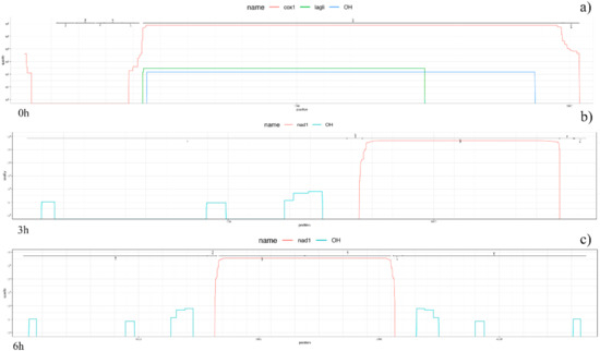 Protein coding gene plots. Figure shows annotated protein coding genes after congruences detection from BLASTX. The protein plot highlights the quality value (on a log scale) for each gene and each position if it is above the threshold. Different genes are evidenced by distinctive colors, with the initial hits corresponding to the represented “mountains”. The lines shown on the top represent the reported annotation. Annotation of protein coding genes reached the best results in untreated sample (a) while, in both time-related treated samples, the only protein coding gene identified with high quality was NAD1 (b,c).