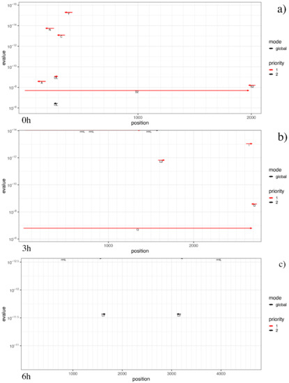 Non-coding RNA plots. The non-coding RNA plots show the hits from computation of rRNAs and tRNAs, differentiating between the hits from the global and local (if present) search by line type. The hits are prioritized: “1” refers to features set in the first round when tools take the prediction hit of each feature, while “2” refers to all other features set afterwards in the remaining unassigned regions. Reverse log scale for the e-value was considered. The untreated sample (a) showed the highest number of annotated tRNAs, as well as the widest positions covered among mitogenomes, while both treated samples (b,c) were the most reliable in rRNA.