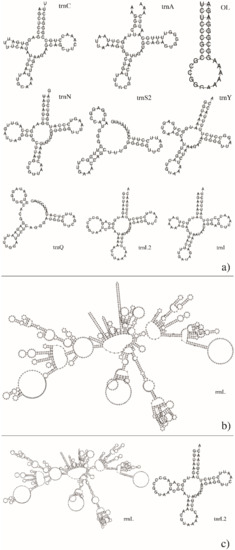 The annotation of protein coding genes reached the best results in the untreated sample, in two genes with high quality score (~102 for LAGLI and ~106 for COX1) and the origin of heavy strand synthesis (OH) was detected. Curiously, in both time-related treated samples, the only protein coding gene identified with high quality was NAD1. The complete protein plots are shown in Figure 4. Furthermore, both treated samples were the most reliable in rRNA computation (e-values ~ 10−14–10−12.5), while the untreated one showed the highest number of annotated tRNAs, as well as the widest positions covered among mitogenomes. Interestingly, data annotation highlighted the longest tRNAs in both untreated and 3h_treated samples, even if with a good but not optimal significance (e-values ~ 10−7). Details on rRNA and tRNA annotations are shown in the non-coding plots of Figure 5. Intriguingly, we were also able to compute the secondary structure of several rRNAs and tRNAs for each sample, the most significant of which are represented in Figure 6. It is clear, especially for rRNAs, how changes in several nucleotides led to different RNA folding.