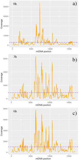 MtDNA-Server coverage plots. Figure shows coverage for each RNA-Seq sample, evaluated in all time-related conditions (a = 0 h, b = 3 h, c = 6 h). Coverage analysis permitted the detection of issues with incorrect concentration of polymerase chain reaction products for the used fragments. The highest coverage was reached around the 7500 nt position in untreated sample (a).