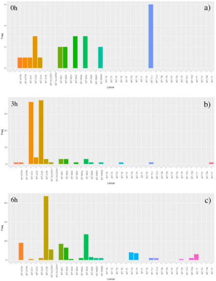 Results of heteroplasmic analyses by mtDNA-Server. The tool mtDNA-Server found heteroplasmic significant results in all samples, evaluated in all time-related conditions (a = 0 h, b = 3 h, c = 6 h), reaching the highest scores in 6 h treated sample. The highest peaks were reached by MT-CO1 and MT-CO3 loci in 3 h treated (b), and by MT-CYB locus in 6 h treatment (c).