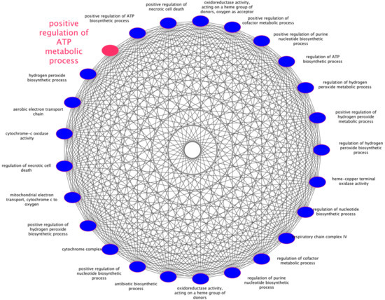 All the 25 clustered sub-pathways obtained from enrichment of mtDNA mutated genes, derived from transcript analysis, thanks to Cytoscape and its plugins ClueGO and CluePedia gave statistically significant results (Figure 9). Among them, seven pathways showed the highest probability of association (Bonferroni step-down corrected p < 0.001), highlighting the most altered functions of mitochondria of RPE stressed cells: “Positive regulation of hydrogen peroxide metabolic process” (p = 1.45 × 10−3), “Regulation of hydrogen peroxide biosynthetic process” (p = 1.80 × 10−3), “positive regulation of hydrogen peroxide biosynthetic process” (p = 1.03 × 10−3), “positive regulation of necrotic cell death” (p = 1.80 × 10−3), “regulation of nucleotide biosynthetic process” (p = 1.55 × 10−3), “positive regulation of cofactor metabolic process” (p = 1.80 × 10−3) and “positive regulation of ATP metabolic process”, that represented the hub-pathway with the highest significance (p = 8.10 × 10−11). Further details on significant pathways are available in Table S2.