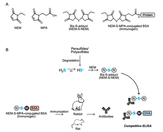 The strategy to generate antibodies for detection of H2S is illustrated in Figure 1B. H2S was derivatized with NEM to form a stable bis-S-adduct, NEM-S-NEM. NEM-S-MPA was synthetized and conjugated to BSA and OVA and used to immunize rabbits and rats to generate polyclonal and monoclonal antibodies, respectively. The generated antibodies were evaluated by competitive ELISA.