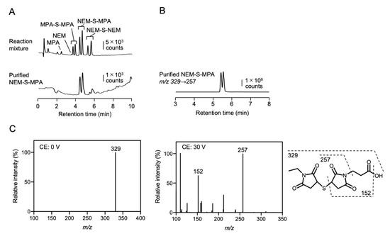 To generate a bis-S-heteroadduct of NEM and MPA, NEM-S-MPA, which can conjugate to proteins via a coupling reaction between the propionic acid moiety of MPA and the amino moiety of protein lysine residues, NEM was reacted with NaHS in the presence of MPA. As shown in Figure 2A (upper), the formed NEM-S-MPA and bis-S-adducts of NEM and MPA, NEM-S-NEM and MPA-S-MPA, respectively, were detected by HPLC. Several studies have reported that the reaction of sulfide with maleimides, such as NEM, can form two distinct diastereomers because the sulfur can react with either C3 or C4 of the maleimide ring [25,26,27]. In fact, the formed respective bis-S-adducts were observed as double peaks by HPLC analysis (Figure 2A, upper). Although the reaction mixture contained NEM-S-NEM, MPA-S-MPA, free MPA, and NEM, the formed NEM-S-MPA were easily separated from the other adducts by HPLC because they have different hydrophobicity (Figure 2A, lower). The purified NEM-S-MPA was also detected as double peaks at retention times of 4.4 and 4.7 min, which were identical to that of the formed NEM-S-MPA in the reaction mixture. By LC-ESI-MS/MS analysis, the purified NEM-S-MPA was detected as protonated molecules of m/z 329 and the MS chromatogram indicated double peaks (Figure 2B). The product ion assignments also evidenced that NEM-S-MPA was successfully prepared (Figure 2C).