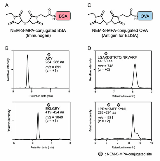 Preparation of immunogen and antigen. Immunogen (A) and antigen for ELISA (C) were prepared by a conjugation of NEM-S-MPA to bovine serum albumin (BSA) and ovalbumin (OVA), respectively. Representative MS chromatograms of peptide fragments containing NEM-S-MPA modifications derived from NEM-S-MPA-conjugated BSA (B) and OVA (D).