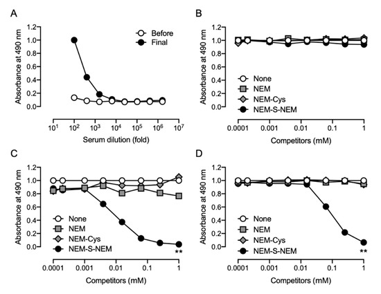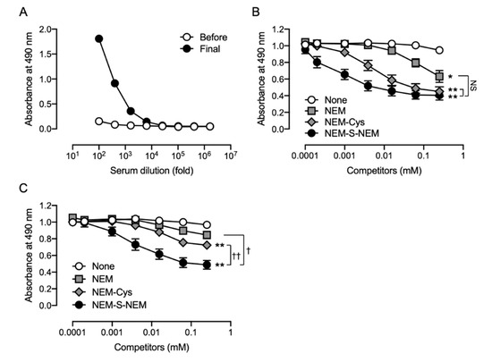 However, NEM-Cys and NEM also inhibited the binding of the pAb to NEM-S-MPA-conjugated OVA (Figure 4B), indicating that the pAb could also recognize NEM and NEM-conjugated thiols, such as cysteine and glutathione. These antibodies, recognizing NEM-conjugated thiols and NEM, were eliminated from the polyclonal antiserum using an affinity column of NEM-NAC-conjugated TOYOPEARL AF-Amino-650 M beads. The binding property of the flow-through fraction was assessed by competitive ELISA; however, the antibodies recognizing NEM and NEM-conjugated thiols were only partially removed from the antiserum (Figure 4C). We performed a statistical analysis to compare the results of Figure 4B,C. The statistical analysis indicated that the reactivity of the rabbit pAb against NEM-Cys and NEM was significantly lower than those of the rabbit serum, while the sensitivity of the rabbit pAb against NEM-S-NEM was significantly lower than that of the rabbit serum. Therefore, as the antibody specificity was not high enough, we decided to not use the rabbit pAb prepared herein for further experiments.