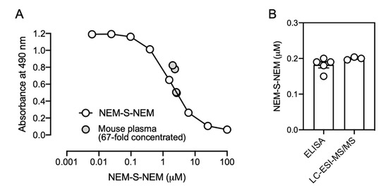 To evaluate whether the immunoassay was useful for analyzing biological samples, mouse plasma obtained from 20-week-old male C57BL/6J mice (Kiwa Laboratory Animals) was utilized. The mice (n = 5) were sacrificed by exsanguination under general anesthesia; plasma was prepared, flash frozen in liquid nitrogen, and stored at −80 °C until further procedures. Plasma was reacted with 10 mM NEM in PBS containing 50% methanol at 37 °C for 1 h. After centrifugation, the supernatant was collected, dried in vacuo, and then dissolved in 0.1% FA, an aliquot of which was analyzed by LC-ESI-MS/MS for quantification of the formed NEM-S-NEM as described previously [8]. For detecting the formed NEM-S-NEM by competitive ELISA to enrich the formed NEM-S-NEM, samples were loaded onto a C18 column (Discovery® DSC-18 500 mg, Sigma-Aldrich), the column was washed with 0.1% FA containing 25% methanol, then NEM-S-NEM was collected with 0.1% FA containing 50% methanol. Eluates were dried in vacuo, and then dissolved in PBS. The final solutions, 67-fold concentrated compared with the original plasma, were utilized as competitors for competitive ELISA as described above. Mouse plasma samples were mixed with rat mAb at a ratio of 1:4. The concentration in the original plasma was calculated by the following formula: the original concentration = the concentration determined by competitive ELISA × 5 (dilution factor) ÷ 67 (concentration factor). The exact values of original mouse plasma determined by competitive ELISA and LC-ESI-MS/MS analysis are described in Supplementary Table S3.